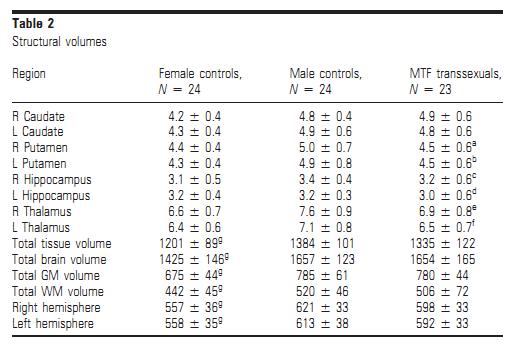 Structural MRI scans were used to compare the size of various brain structures between three groups of volunteers: heterosexual men, heterosexual women and the transexuals (or "MtF"s as I will call them for short) who were diagnosed with gender dysphoria and were "genetically and phenotypically males".